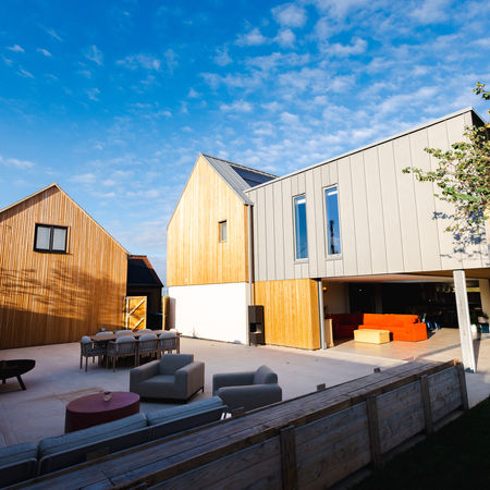 This striking contemporary home features a bold, angular design with two projecting upper-level volumes framed in sleek metal cladding. Expansive floor-to-ceiling windows flood the interior with natural light and offer seamless views of the surrounding landscape, while the lower level opens fully to the outdoors through wide sliding panels, creating a smooth indoor–outdoor flow. Warm wooden accents contrast beautifully with the modern lines, giving the structure both character and warmth. Set against a spacious green lawn and illuminated by soft natural light, the build feels open, inviting, and thoughtfully connected to its environment.